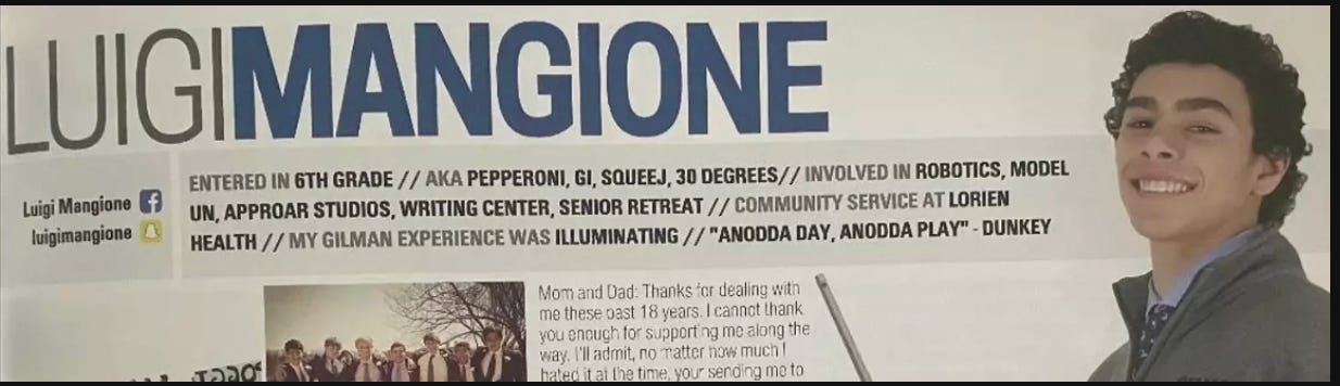 Thanks to a kind reader, I’ve learned that Luigi Mangione’s Substack handle and Substack title, Another Day, Another Play, likely comes from his yearbook quote, which is (less poetic) "Anodda day, anodda play.” The quote is from a YouTuber named “videogamedunkey.” Here is the article substantiating this, which I consider reliable.